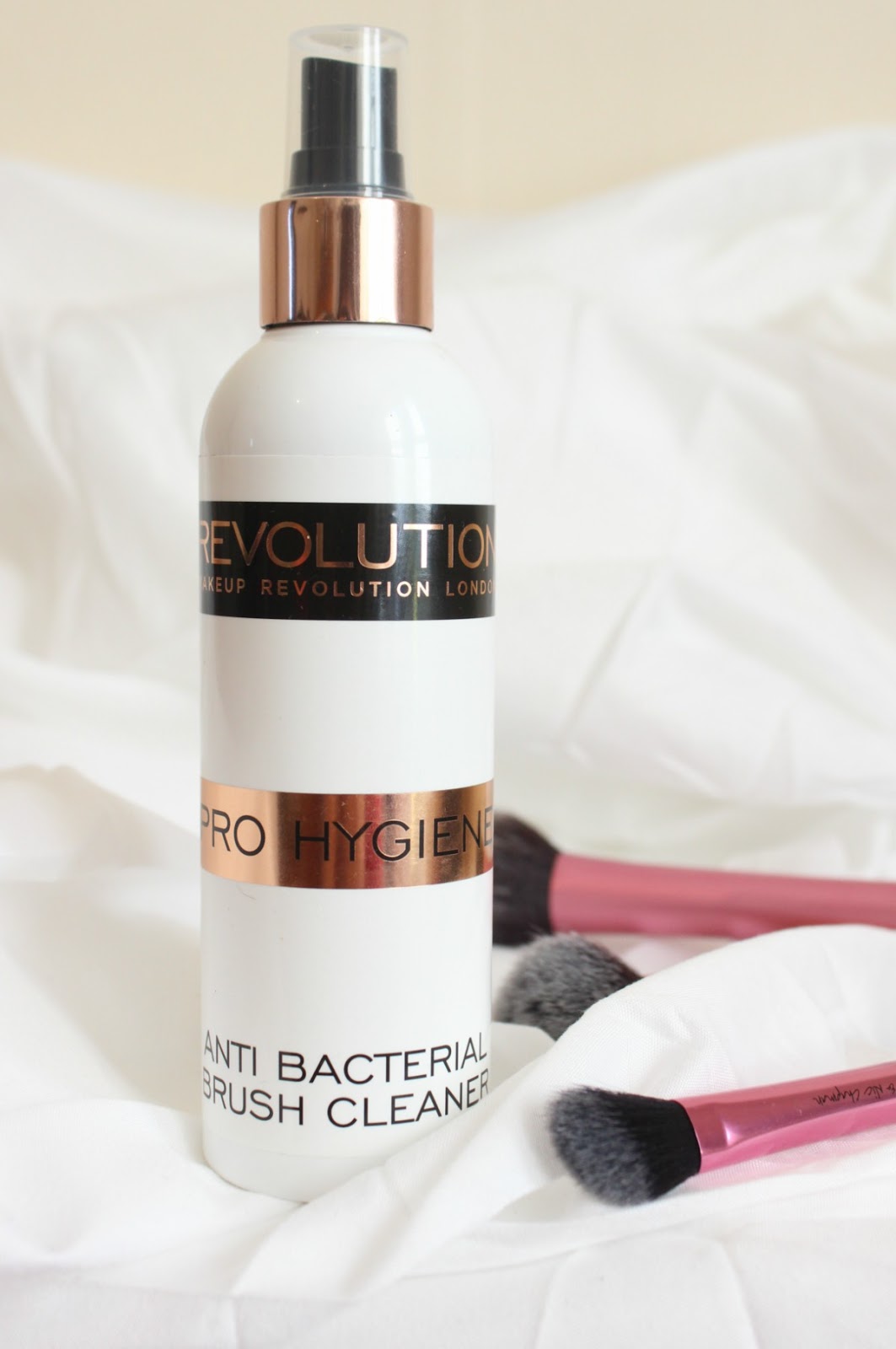 First things first, how do you use an on-the-spot brush cleanser" It is a lot easier than it sounds, basically you take your cleansing spray be it the Revolution Pro Hygiene Anti Bacterial Brush Cleaner, or anything similar, mist onto the brushes and gently swipe the make-up off using tissue, then leave the brush to fully dry (less than an hour in my experience). Admittedly such method won't remove every trace of make-up but it is a quick and easy way to keep germs at bay and of course re-freshen your tools. Personally I tend to use the on-the-spot brush cleansing method when travelling, that way I don't need to pack endless brushes and of course ...