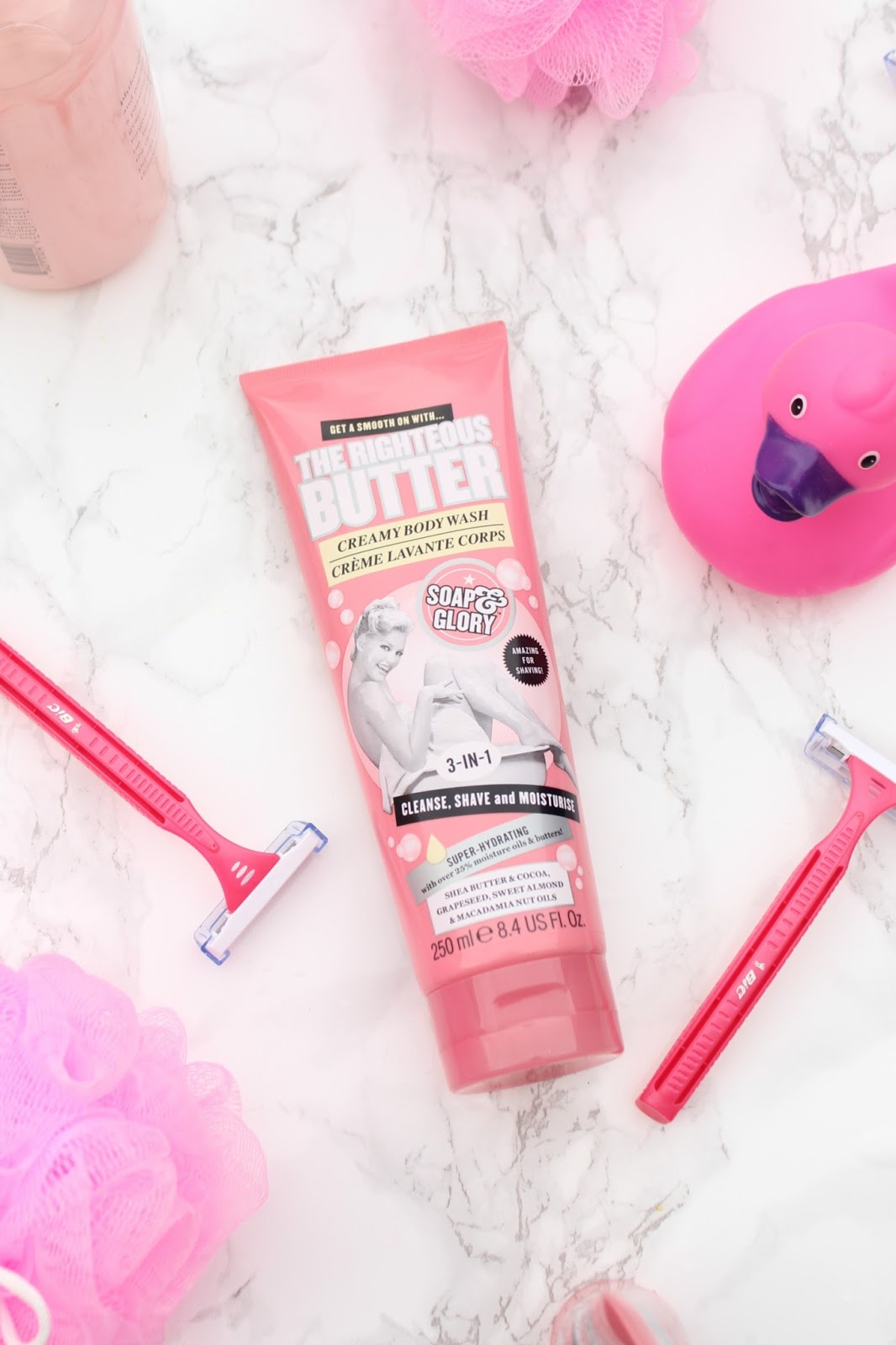 Typically speaking you can shave your legs, armpits or anywhere you desire using a shower gel, hair conditioner or plain old soap and water as a lubricant for the razor to glide over, but most will not offer a nourishing barrier, which could result in dry and/or irritated skin. This is where Soap & Glory The Righteous Butter 3-in-1 Ultra Rich & Creamy Body Wash is different; yes it foams and creates a soapy shield to prevent a shaving rash and accidental nicks; as it contains over 25% natural oils and butters (shea butter, cocoa butter, sweet almond, grapeseed and macadamia oils and vitamin E) it nourishes and moisturises the skin without the need to as much as look at a separate body butter. ...